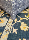 New hand-knotted and hand-cut wool Oushak inspired rug made by our artisans in India with super soft high quality pure New Zealand wool and sustainable dyes using traditional Turkish techniques. Soft tones of indigo, sapphire, saffron, basil and slate in a classic geometric pattern with border.