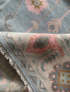 New hand-knotted and hand-cut wool Oushak inspired rug made in India by our artisans with super soft high quality pure New Zealand wool and sustainable dyes using traditional Turkish techniques. Soft tones of sapphire, blossom, sand, persimmon and stone in a classic geometric pattern with border.