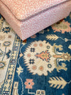 New hand-knotted and hand-cut wool Oushak inspired rug made by our artisans in India with super soft high quality pure New Zealand wool and sustainable dyes using traditional Turkish techniques. Soft tones of indigo, ivory and blossom in a classic geometric pattern with border.