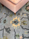 New hand-knotted and hand-cut wool Oushak inspired rug made by our artisans in India with super soft high quality pure New Zealand wool and sustainable dyes using traditional Turkish techniques. Soft tones of teal, aquamarine, pear, blossom and slate in a classic organic pattern with border.