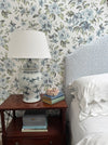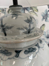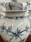 Large teal and white hand-painted lamps with bamboo motif. Wired for Australian standards.